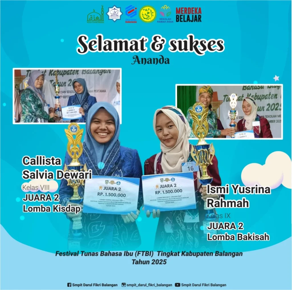 Balangan, 28 September 2025 — Kabar membanggakan datang dari SMPIT Darul Fikri Balangan. Dua siswi berprestasi kembali mengharumkan nama sekolah dalam ajang Festival Tunas Bahasa Ibu (FTBI) Bahasa Banjar Tingkat Kabupaten Balangan Tahun 2025 yang diselenggarakan oleh Dinas Pendidikan dan Kebudayaan Kabupaten Balangan pada Sabtu, 27 September 2025.